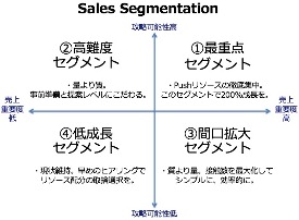 ・顧客を任意のセグメント毎に分類し、それぞれで営業方針を定めると良い。以下はセールスセグメンテーションの一例(定量化ロジックについてはここでは記載を割愛します)。